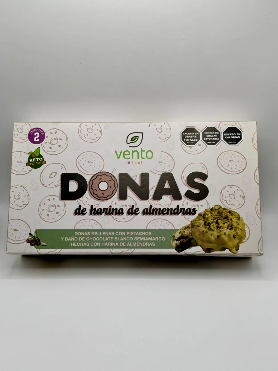 DONAS DE ALMENDRAS RELLENAS CON PISTACHO Y BAÑO BLANCO SIN AZUCAR X 2U VENTOFIT